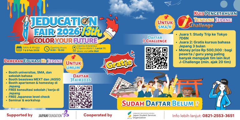 Jeducation Fair, Previous EventJapan Education Fair 2026 – Study to Japan Daftar di Sini Bukan sekadar pameran. Ini tempat masa depanmu dimulai. Mulai Perjalanan Studi ke Jepang di Sini List sekolah peserta Edufair Klik di sini! …